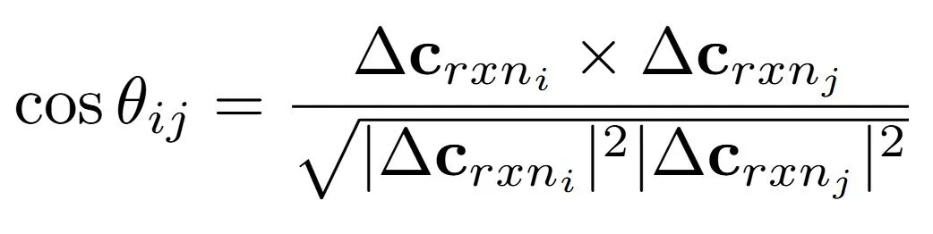 Additionally, we use the cosine similarity between different average transformation vectors to find that they encode syntactical relationship between the reaction formulas. A cosine similarity between two vectors is given as