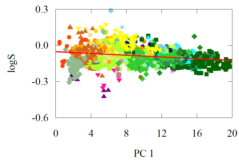 Take carbons with fewer heteroatoms (like nitrogen, oxygen, or fluorine) around them—they tend to make the molecule less soluble, which aligns with our understanding of chemistry. Conversely, carbons with more heteroatoms tend to increase solubility. The model has also picked up on trends regarding symmetry: molecules with highly symmetric structures tend to have lower polarity, and thus lower solubility.