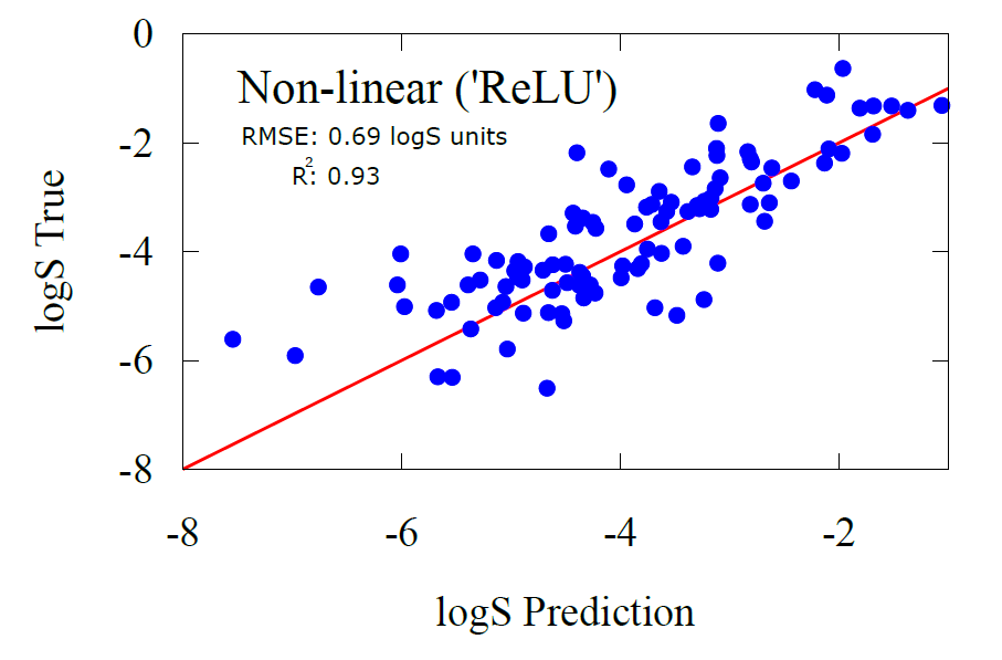 To the side is a visual comparison between the predictions of our transfer learning model and the actual values of pKa found in our datasets, a.k.a a performance assessment of our transfer learning model. If the model is to be considered accurate, most datapoints have to lie somewhat neatly on a line. The closer they are to the red line in the figure below the greater the accuracy of our transfer learning model. We also show it quantitatively using a measure of root mean squared error (RMSE) which is a measure of how much deviation our predictions our from their bulls-eye value!