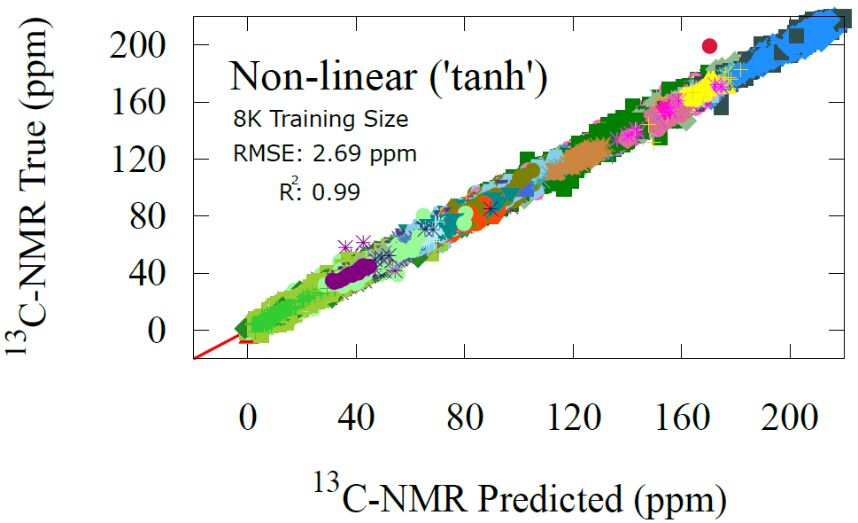 Similarly, we can look at how our transfer model performs on the carbon NMR shifts. Here, we have the advantage of having much data and instantly we find that the transfer learning model shows near perfect alignment and giving a RMSE of just 2.69 ppm which is highly accurate to any other method, including advanced electronic structure methods or full-fledged graph probabilistic models. See out full article below for benchmarking comparisons [1].