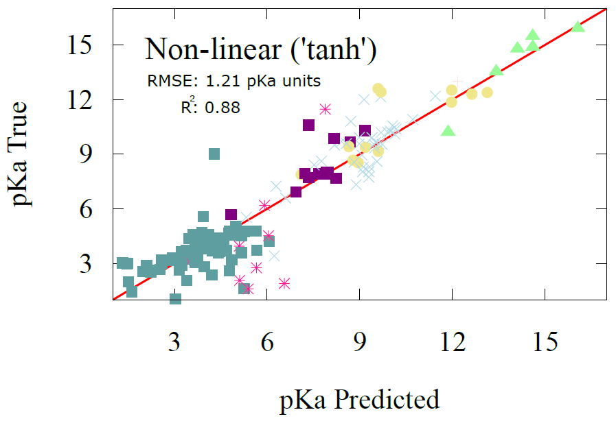 Our results show that pKa error can be reduced to within 1.21 pKa units which is within accuracy of most advanced electronic structure methods and compares to employing full-fledged graph neural network training on pKa with thousands of datasets, as was done by Mayr et al. In other words, we have managed to reduce the amount of data and the complexity of the model significantly, without sacrificing much on accuracy.