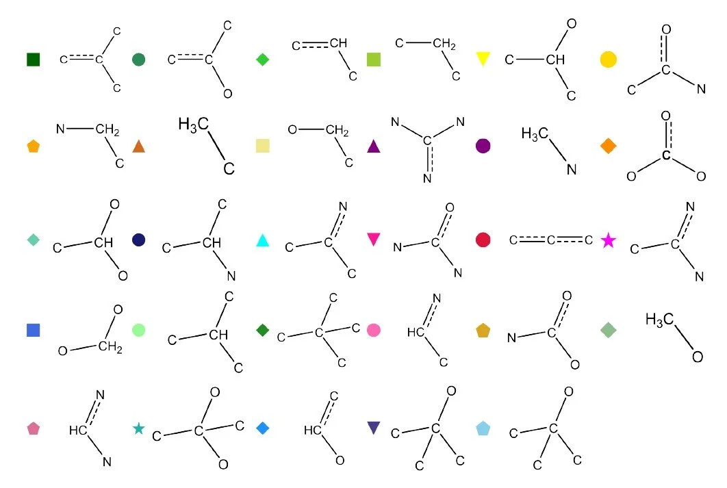 There are also counterintuitive trends that the model captures correctly. Simple methyl groups often contribute positively to solubility in small molecules, because their protrusion can disrupt symmetry and induce a weak net polarity. In contrast, O-methyl groups contribute negatively, despite breaking symmetry. This aligns with chemical intuition: an O-methyl substituent blocks a potential hydrogen bonding site, reducing the molecule’s ability to interact favorably with water. The AFV-based model recovers these subtle effects without explicit chemical rules, indicating that the learned representations retain nuanced information about symmetry, polarity, and local electronic environments.