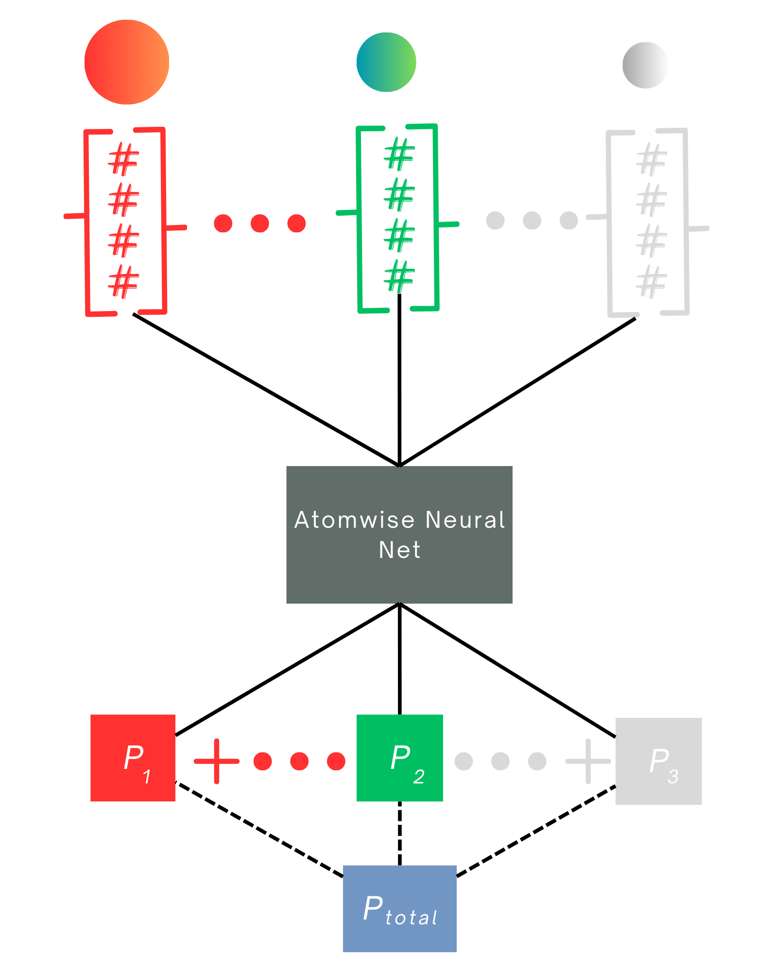 The third model is used for size extensive molecular properties such as solubility or total electron density. In this case, the atomwise neural network is applied to every atom’s AFV to generate atomwise contributions that are then pooled by summation to produce the total molecular value. The model is trained on the molecular target, ensuring that the learned atomwise contributions scale appropriately with molecular size and composition.