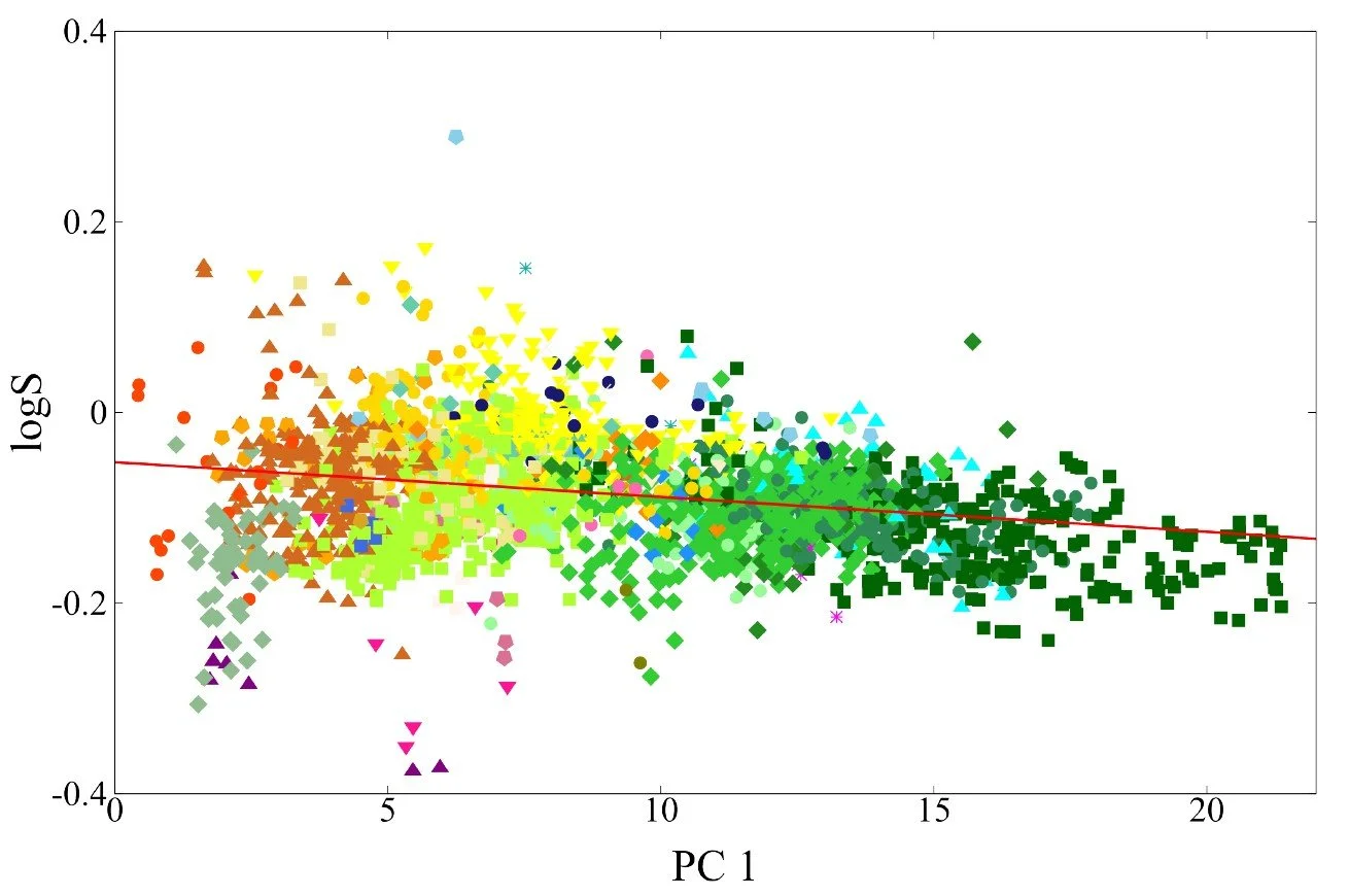 One challenge with size extensive models is interpreting the contribution that each atom makes to the total property. For solubility, such decomposition is not uniquely defined because solubility is a global thermodynamic quantity. Nevertheless, the atomwise contributions learned by the model can reveal useful patterns. To illustrate this, we plot the carbon centered contributions to logS against the first principal component of the AFV space, which captures broad structural differences between molecular environments (see previous post). Clear trends emerge. Carbons in hydrophobic environments, lacking nearby heteroatoms, contribute negatively to solubility, whereas carbons adjacent to oxygen or nitrogen tend to contribute positively. These trends reflect the chemical intuition underlying solubility and demonstrate that the AFV based size extensive model can learn interpretable structure property relationships from relatively small datasets.