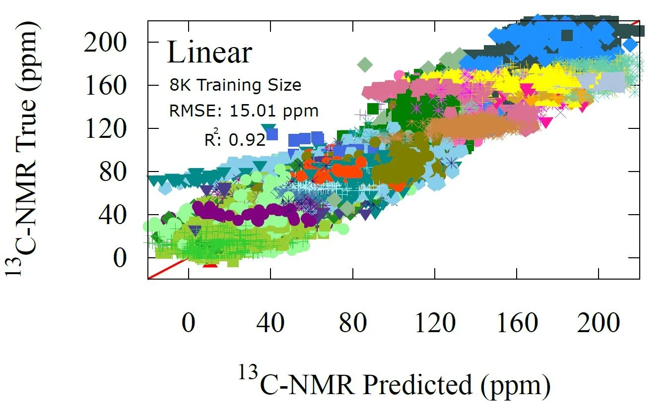 Fig 7 - NMR prediction performance of the non-linear transfer learning model trained on 8K datapoints. The non-linear model trained with 481 points achieved same precision as the linear, signifying a data limitation not an architectural one.