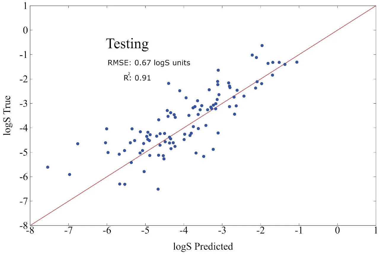 Solubility is an intrinsically complex property, influenced by thermodynamics, molecular polarity, hydrogen bonding, and the subtle interactions that arise when a solute becomes fully surrounded by water molecules. The quantity we predict is logS, the logarithm of the number of grams of solute that dissolve in a liter of water. Using only 640 training points from the NP MRD database, the model achieves competitive accuracy on a 160 point test set. The resulting RMSE OF 0.64 lies within the range of established physics based methods such as DFT and continuum solvation models, which typically achieve errors of roughly 0.5 to 2.0 units.
