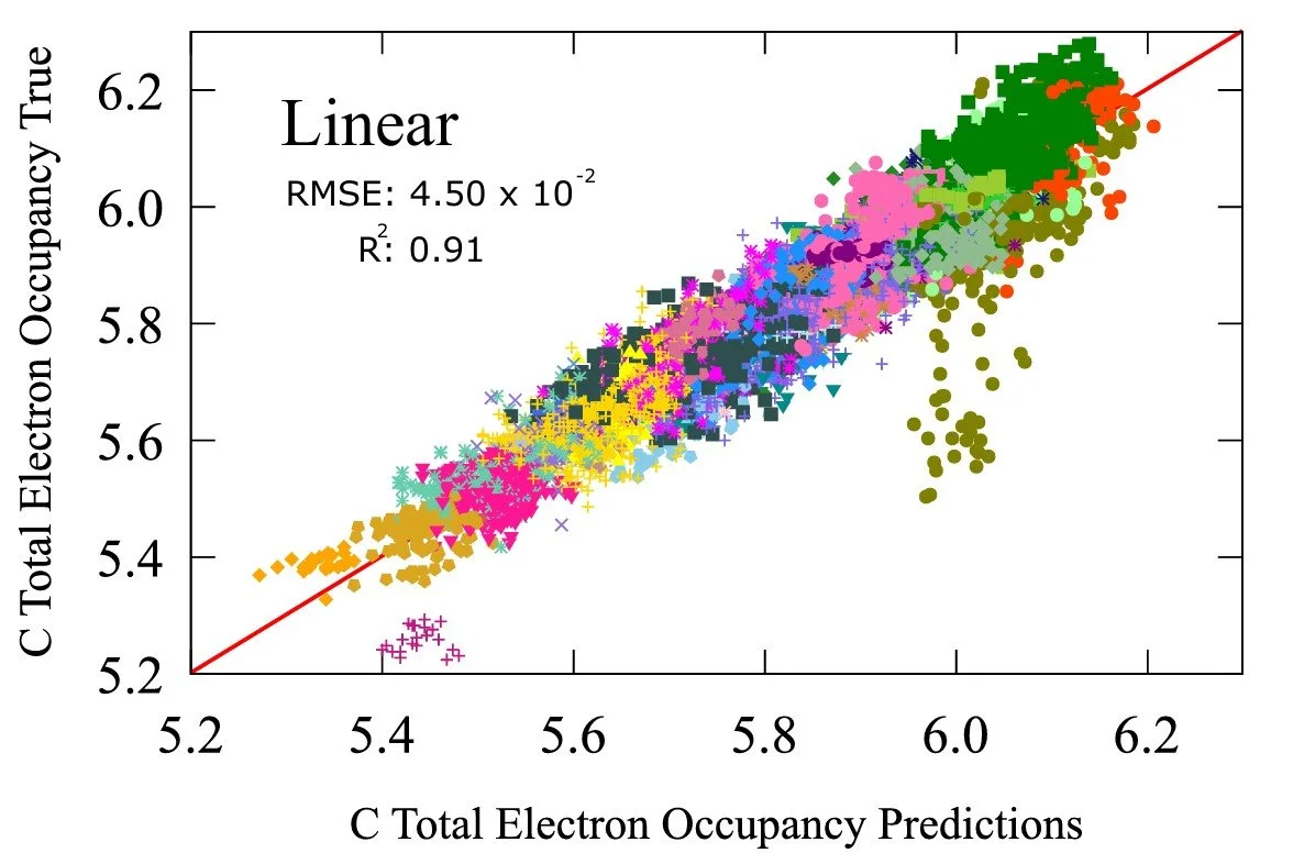 The linear regression model achieves an error 0.0450 with a correlation coefficient of 0.91, already signifying strong qualitative relationship. The non-linear model achieves a scale in magnitude lower in accuracy giving 0.00936 with a correlation coefficient of 1.00. This is a property that is traditionally derived from the electronic structure calculation of a molecule. A mechanistic model rather than a probabilistic model. But here we show that a probabilistic model can obtain almost identical results with the mechanistic ones.